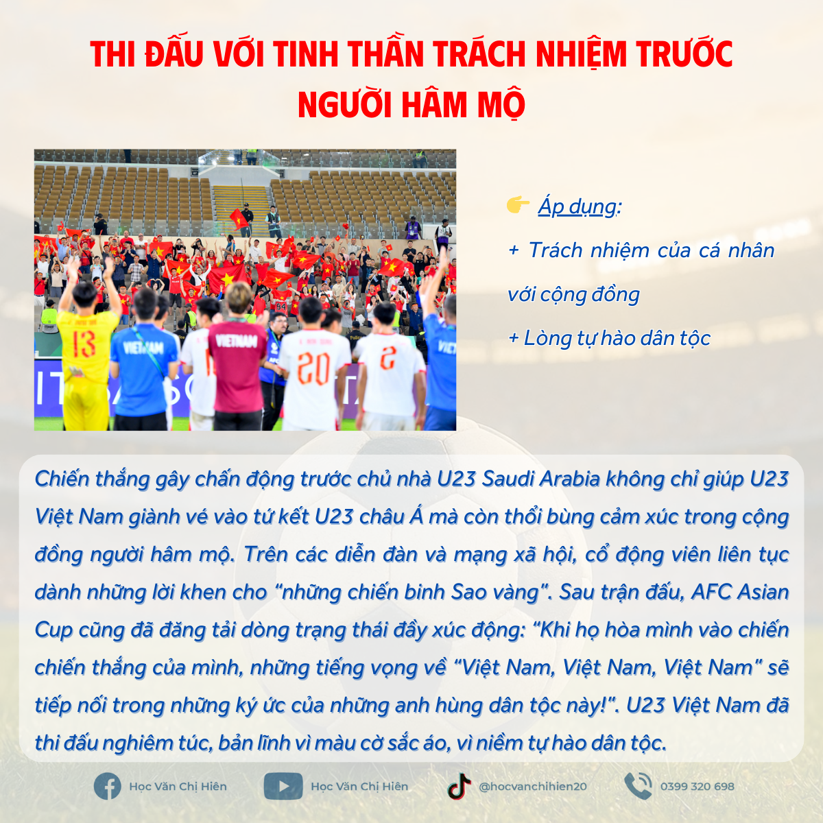 Chiến thắng gây chấn động trước chủ nhà U23 Saudi Arabia không chỉ giúp U23 Việt Nam giành vé vào tứ kết U23 châu Á mà còn thổi bùng cảm xúc trong cộng đồng người hâm mộ. Trên các diễn đàn và mạng xã hội, cổ động viên liên tục dành những lời khen cho “những chiến binh Sao vàng”. Sau trận đấu, AFC Asian Cup cũng đã đăng tải dòng trạng thái đầy xúc động: “Khi họ hòa mình vào chiến chiến thắng của mình, những tiếng vọng về “Việt Nam, Việt Nam, Việt Nam” sẽ tiếp nối trong những ký ức của những anh hùng dân tộc này!”. U23 Việt Nam đã thi đấu nghiêm túc, bản lĩnh vì màu cờ sắc áo, vì niềm tự hào dân tộc.