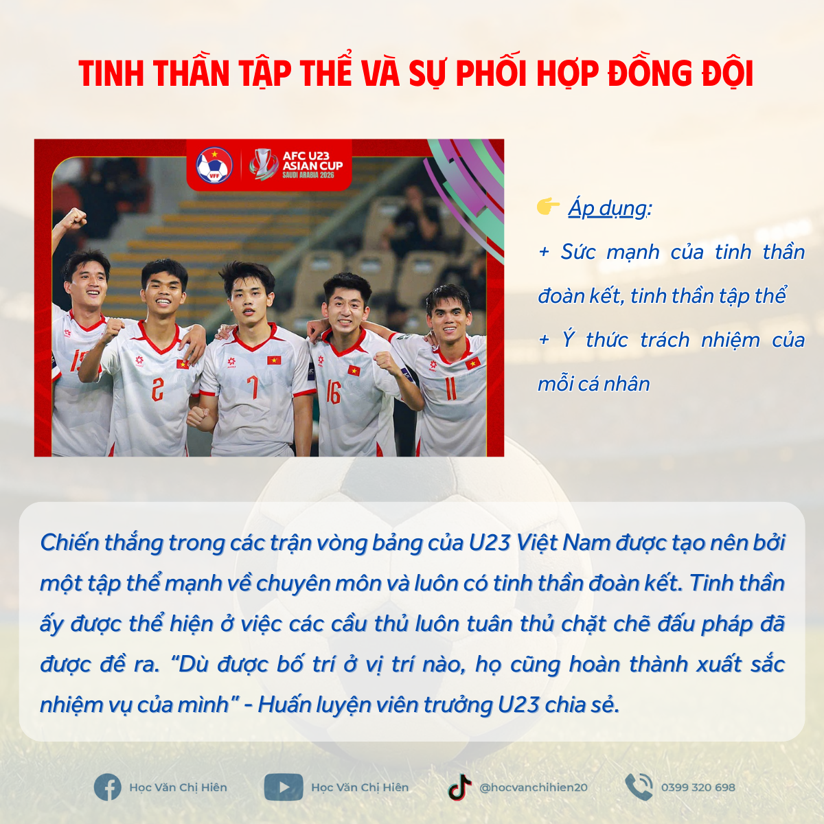 Chiến thắng trong các trận vòng bảng của U23 Việt Nam được tạo nên bởi một tập thể mạnh về chuyên môn và luôn có tinh thần đoàn kết. Tinh thần ấy được thể hiện ở việc các cầu thủ luôn tuân thủ chặt chẽ đấu pháp đã được đề ra. “Dù được bố trí ở vị trí nào, họ cũng hoàn thành xuất sắc nhiệm vụ của mình” - Huấn luyện viên trưởng U23 chia sẻ.